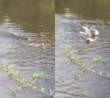 Sua dona gritou desesperadamente para o cachorro voltar e ele chegou a sair da água na primeira vez, mas voltou a entrar na água e foi surpreendido pelo jacaré que o abocanhou.