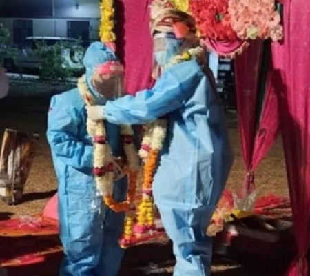 O casal, cujos nomes não foram divulgados, decidiu prosseguir com a cerimônia no domingo (6/12), no pátio do centro de quarentena Covid-19 em Baran, no estado de Rajastão, no oeste do país. Os equipamentos de proteção deram a sensação de casamento de ficção científica.
