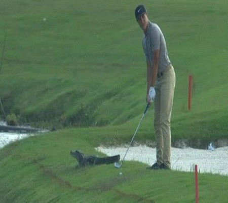 Recentemente, um jogador de golfe americano se deparou com uma situação, no mínimo, incomum. Participandode do torneio Zurich Classic, Cameron Champ tinha que dar uma tacada, mas pertinho dele encontrava-se um aligátor, ou seja, jacaré americano, que ficou parado enquanto o jogador se concentrava.