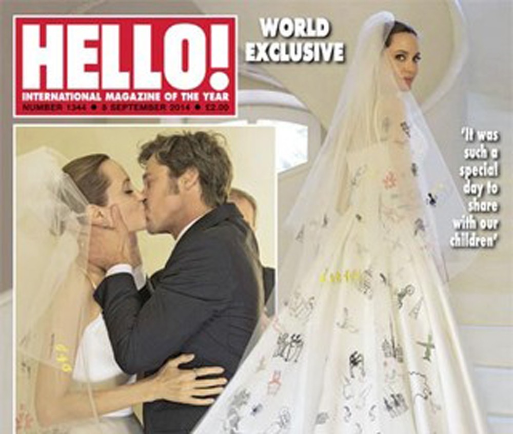 Desta vez, Jolie é a estrela principal das fotos, onde brilha em um vestido Atelier Versace personalizado com desenhos de seus filhos com Pitt: Maddox, 13, Pax, 10, Zahara, 9, Shiloh, 8 e Vivienne e Knox, 6. Segundo relatos, o designer Luigi Massi, mestre alfaiate da casa de design, costurou os desenhos diretamente sobre o vestido.