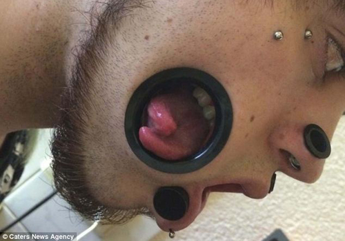 Um jovem chegou furou suas buchechas com grandes buracos para mostrar os dentes mesmo sem ter que abrir a boca.