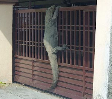 Imagina começar o dia vendo essa cena na porta da sua casa: um lagarto de quase três metros tentando invadir sua casa sem cerimônias. A cena aterrorizante na Malásia foi encarada com muito humor no Facebook, onde ele postou as imagens. As informações são do R7.