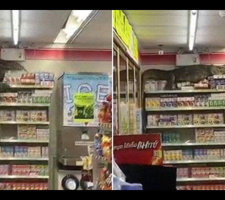Um enorme lagarto-monitor-de-água levou pânico aos frequentadores de uma filial da rede de supermercado supermercados 7 Eleven, em Nakhon Pathom (Tailândia). O animal derrubou vários produtos enquanto escalava as pratileiras do estabelecimento.