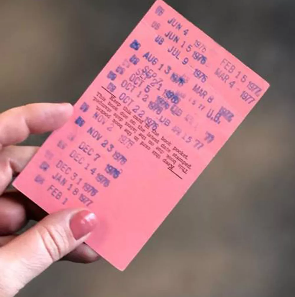 O cartão de empréstimos tinha como data de devolução um dia de 1977. O livro havia sido retirado da filial da biblioteca em Union Branch.