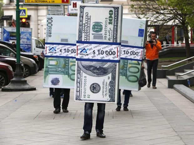 Trio de maços de dólares e euros anda pelas ruas de Moscou, na Rússia (Foto: Sergei Karpukhin/Reuters)