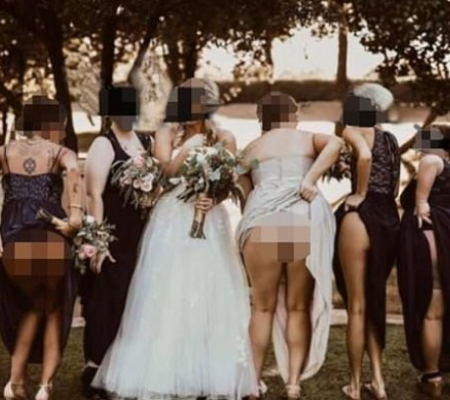O que poderia ser apenas uma piada entre madrinhas de casamento e a noiva, tornou-se motivo para muitas reações muito negativas nas redes sociais. As críticas vieram após uma publicação - feita pela própria noiva no Facebook - da foto na qual as mulheres mostram “mais do que deveriam”. As informações são do IG.