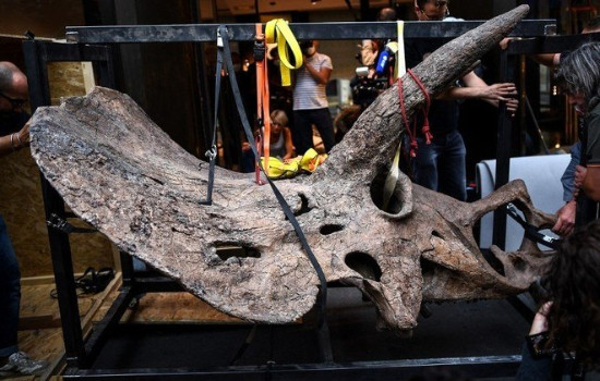 O gigantesco crânio tem dois metros de largura e a estrutura tem cerca de 200 ossos, que na terça-feira já estavam sendo montados em Drouot.