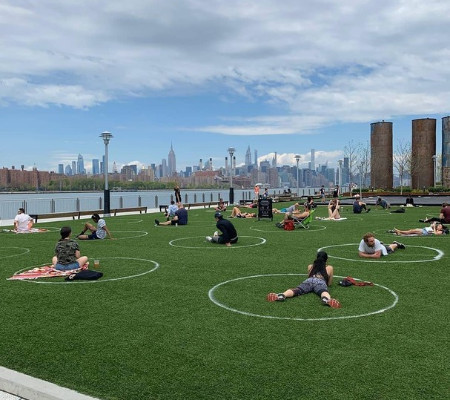No Domino Park, em Williamsburg, por exemplo, foram colocados círculos brancos na grama a fim de ajudar pessoas a manterem distanciamento por conta do coronavírus. Agora é possível encontrar a marcação, mostrando aos novaiorquinos como eles podem descansar, sem colocar a saúde em risco. Na imagem, os círculos aparecem separados por uma distância de 1 metro.