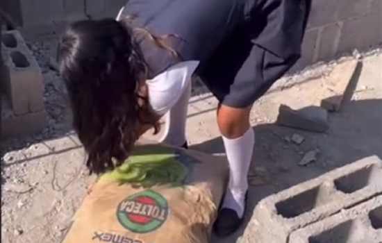 No vídeo, a garota teve que cumprir algumas atividades da construção civil, como levantar sacos de cimento. "O que pesa mais o cimento ou os livros?", é o que consta na descrição da imagem.