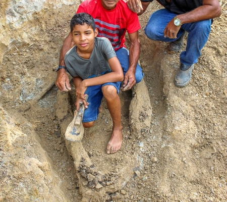 Ele e seu pai acharam o fóssil na quinta-feira (11) e um paleontólogo da Universidade Federal do Acre (Ufac) está no local, desde terça (16), para fazer a remoção. “Estava pescando com meu pai, aí pisei em alguma coisa diferente e chamei ele. Meu pai escavou um pouco e eu achei que era um dinossauro”, disse o menino.