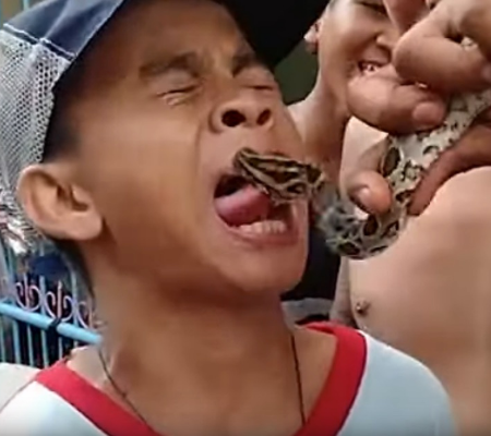 A ação foi toda registrada em vídeo. Nas imagens, o menino, não identificado, acabou atacado pela píton, que cravou as presas na língua da criança.