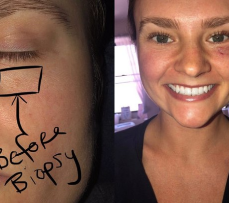Gibson finalmente decidiu consultar um dermatologista, que pediu uma biópsia, no início deste ano. Uma semana após o exame, ela foi diagnosticada com carcinoma basocelular, a forma mais comum do câncer de pele . Diante disso, precisou passar por duas cirurgias, sendo uma para remover o câncer e outra para reconstruir a área do rosto afetada.