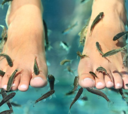 Antes de continuarmos, vale entender como funciona o procedimento. É simples: você mergulha os pés em uma bacia de água com uma espécie chamada “peixe-médico” para que eles comam a pele morta.