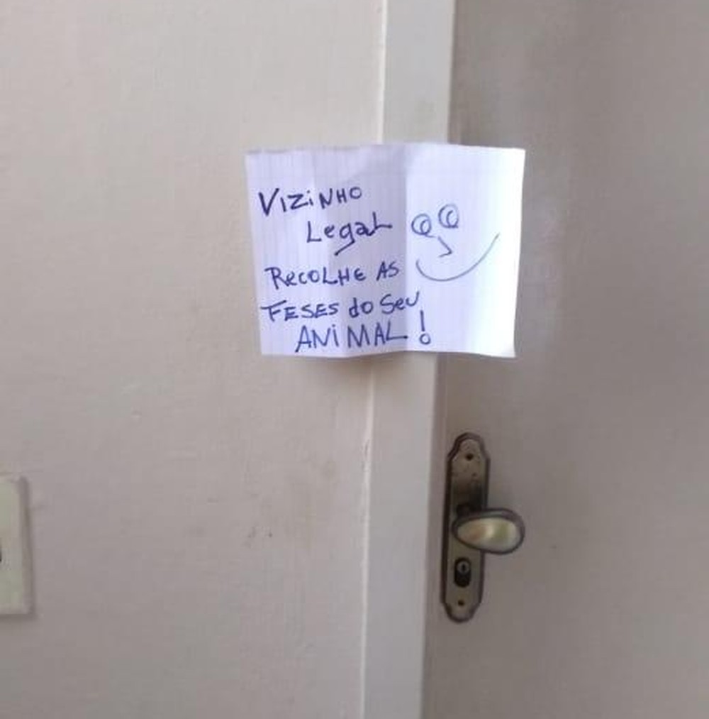 Uma mulher, moradora de um conjunto habitacional de Cubatão (SP) recebeu um bilhete com fezes do próprio cachorro na porta de casa por não recolher os dejetos do animal. Segundo moradores que conversaram com o G1, ela havia sido alertada para realizar a coleta, mas não a fez.