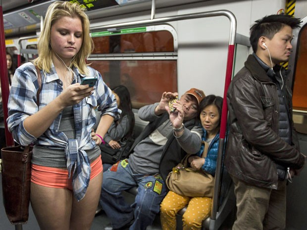 Mulher viaja no metrô neste domingo (12), em Hong Kong sem calças, só de calcinha. Ela participa do evento chamado "Viagem sem calças no metrô", quando, uma vez por ano, as pessoas ficam apenas de roupa de baixo e seguem para sua rotina normal.