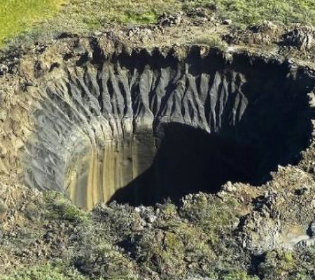 O buraco apareceu de repente: explodiu, deixando uma marca irregular na paisagem. Em torno da borda da cratera, há uma mistura confusa e cinza de terra, gelo e torrões de permafrost. As raízes das plantas — recém-expostas ao redor da borda — mostram sinais de queimadura. Dá uma ideia da violência com que se materializou esse buraco no meio do Ártico siberiano.