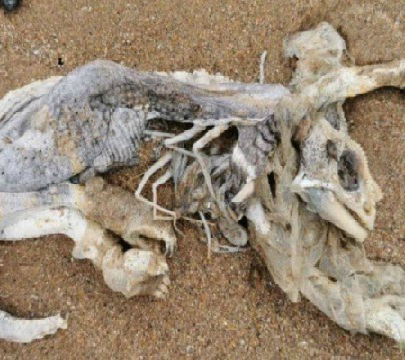 A foto de uma criatura achada na areia de uma praia de Aberdeen (Escócia) está intrigando muitos internautas. O corpo ainda tinha partes com pelos, o que indica pertencer a um gato ou algum outro tipo de mamífero de pequeno porte. O crânio, entretanto, parece ser de um réptil, possivelmente um lagarto.