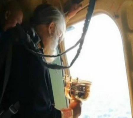 Em vez de lançar água benta com aspersório (pequeno objeto onde se coloca água benta para o sacerdote aspergir o povo, lugares e objetos a serem abençoados), Goryachev usou um cálice, para que o vento não jogasse a água de volta à aeronave.