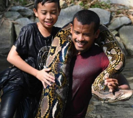 Em um vídeo impressionante compartilhado nas redes sociais, Mohd Redzuan e seu filho foram vistos brincando na água com Cik Kiah, uma enorme cobra píton criada pela família. O vídeo foi gravado em Balik Pulau, na Malásia.