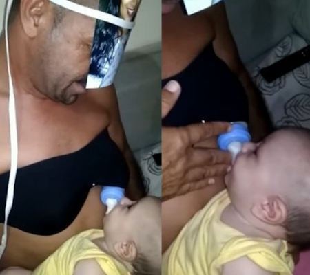 A solução que o pai encontrou para dar leite ao filho foi "amamentá-lo". Assim, ele prendeu a mamadeira em um top, simulando um peito, e ainda completou o visual colocando uma foto da esposa no rosto para que Vinicius realmente acreditasse ser a mãe.