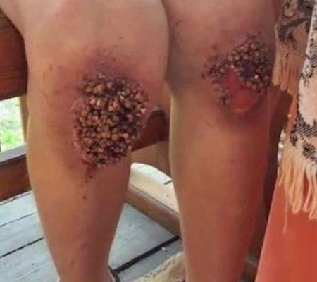 A ideia teria partido do padrasto da criança, Sergey Kazakov, de 35 anos. A mãe, Alina Yumasheva, de 27 anos, teria concordado e assistido à punição, que durou um período de 10 dias. Alguns grãos penetraram na pele que cobre o joelho do menino. As imagens são fortes.