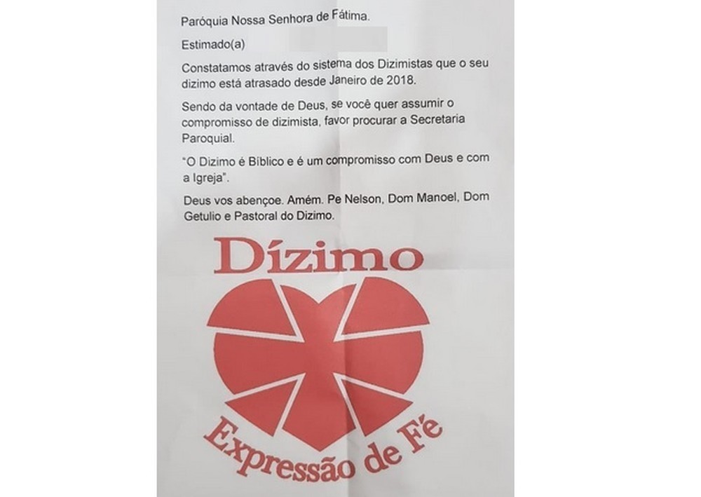 Paróquia manda carta aos fiéis avisando que dízimo está atrasado