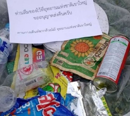 Junto com garrafas plásticas vazias, latas e embalagens de chips, a mensagem no post do Facebook contém diz: "Você esqueceu essas coisas no Parque Nacional Khao Yai".