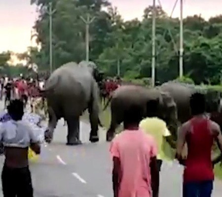 Elefantes passaram em grupo no meio das pessoas. (Foto:Reprodução-Vídeo-Tahir Ibn Manzoor (via The Sun)
