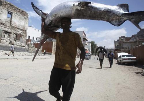 Pescador usa a cabeça para carregar peixe-espada enorme até mercado em Mogadishu, na Somália.