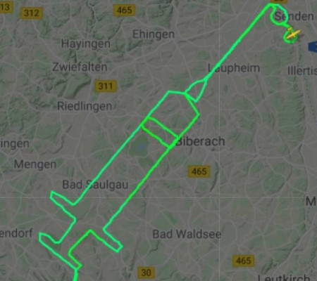 Um piloto de avião ‘desenhou’ uma seringa de 200 km no céu para celebrar o início da campanha de vacinação contra a Covid-19 na Europa. Informações do Metro.