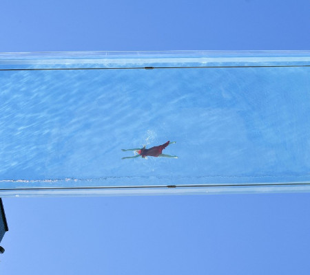 A partir do próximo dia 19 de maio, os moradores de um edifício de Londres poderão atravessar de um bloco ao outro nadando. Isso mesmo, pois será inaugurada a Sky Pool, ou piscina do céu. Trata-se de uma piscina de acrílico transparente, cujas laterais possuem 20 cm de espessura e a estrutura pesa o equivalente a 50 toneladas.