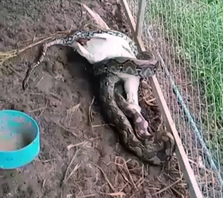 Uma píton de quatro metros de comprimento foi surpreendida ao tentar engolir um ganso em uma fazenda. O réptil atacou o pobre ganso, que aparentemente não teve a mínima chance de se defender e acabou sendo dominado e morto.