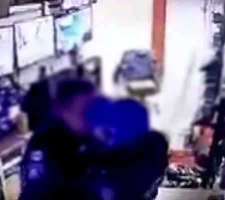 Os policiais foram flagrados fazendo sexo em pé, apoiados em uma mesa
