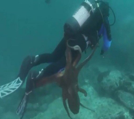 Segundo o "Daily Mirror", o mergulhador é originário de Mayak Gamov (Rússia). O polvo se aproximou por trás, sem que a "presa" percebesse, e se agarrou ao corpo dela.