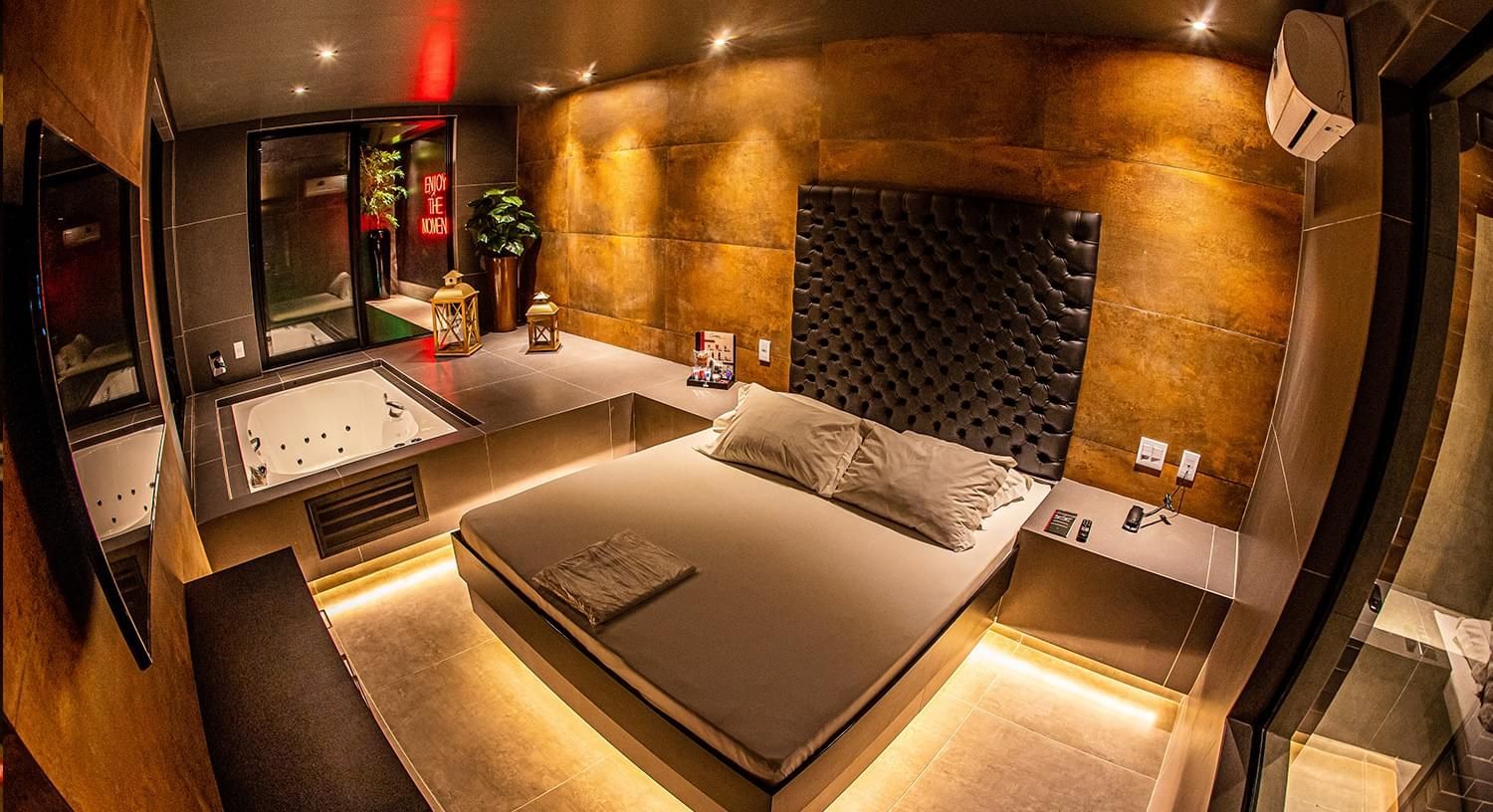 Na suíte há um cardápio com deliciosas opções e alguns produtos eróticos para tornar seu momento ainda mais especial;