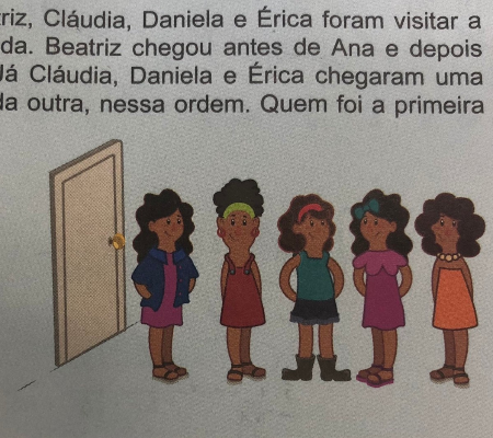 "Ana, Beatriz, Cláudia, Daniela e Érica foram visitar a vovó Margarida. Beatriz chegou antes de Ana e depois de Daniela. Já Cláudia, Daniela e Érica chegaram uma em seguida da outra, nessa ordem. Quem foi a primeira a chegar?", diz o enunciado da questão.