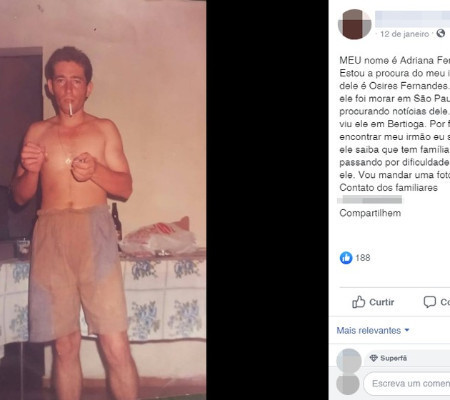 Pouco tempo depois da postagem, Adriane recebeu a mensagem de um senhor que morava próximo ao local de trabalho do irmão. "Era muito difícil não saber se ele estava vivo, ou se estava passando alguma necessidade", relata.