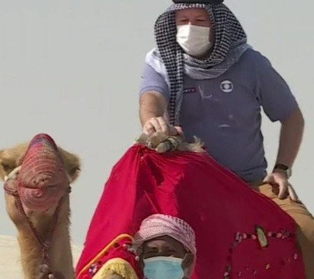 "Não poderei descer do camelo, ao vivo na reportagem, porque rasguei a calça aqui", disse o repórter, que acabou arrancando risadas do âncora Rodrigo Bocardi.
