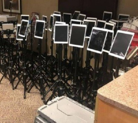 Os equipamentos estão sendo preparados para que as pessoas chamadas ao hospital possam se despedir dos seus entes queridos internados sem se aproximar deles. O grande número de iPads indica que não são poucos os pacientes à beira da morte.