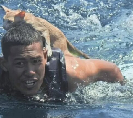 Para a surpresa dos oficiais, quatro gatos lutavam pela vida entre os destroços da embarcação. A situação dos filhotes emocionou os marinheiros, especialmente o fuzileiro Tatpon Saie, que não pensou duas vezes antes de se jogar no mar para salvar os animais. Agarrados às costas de Saie, cada um dos filhotes foi resgatado.