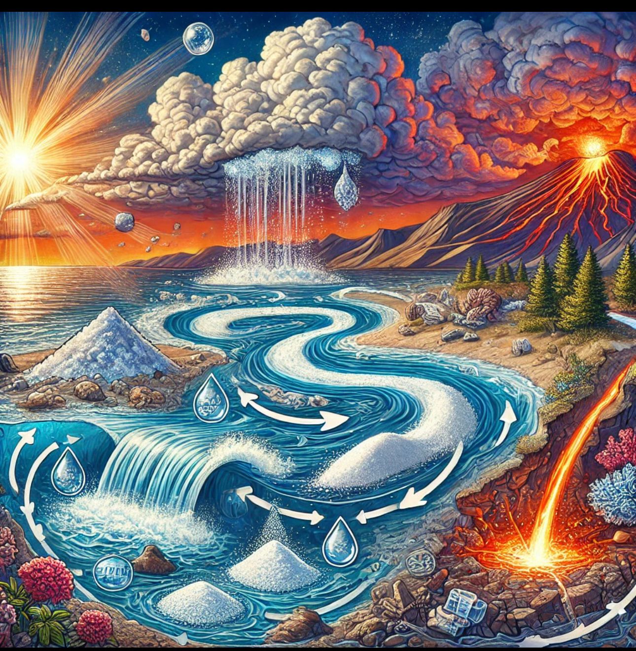 Embora os rios não sejam tão salgados, eles carregam pequenas quantidades de sais dissolvidos, adquiridos através da erosão de rochas. Quando esses minerais chegam aos oceanos, a água evapora continuamente (no ciclo da água), mas os sais permanecem. Esse processo gradual concentrou os sais nos oceanos ao longo do tempo.
