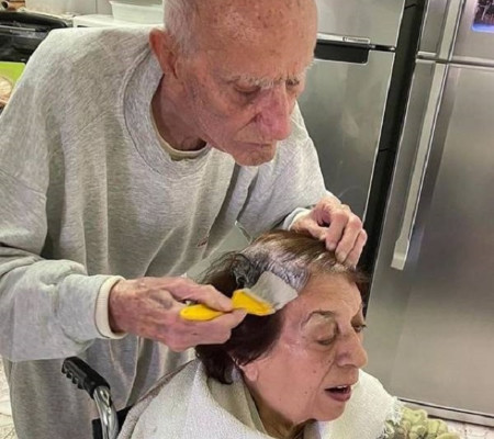Porém, isso não foi um problema para este casal de idosos. Sem poderem sair de casa, um senhor de 92 anos decidiu pintar o cabelo branco da sua mulher.