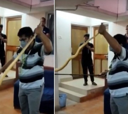 Uma enorme serpente invadiu o quarto no qual médicos que atuam no combate à covid-19 estão hospedados, em Bhubaneswar, na Índia. Com informações do R7.