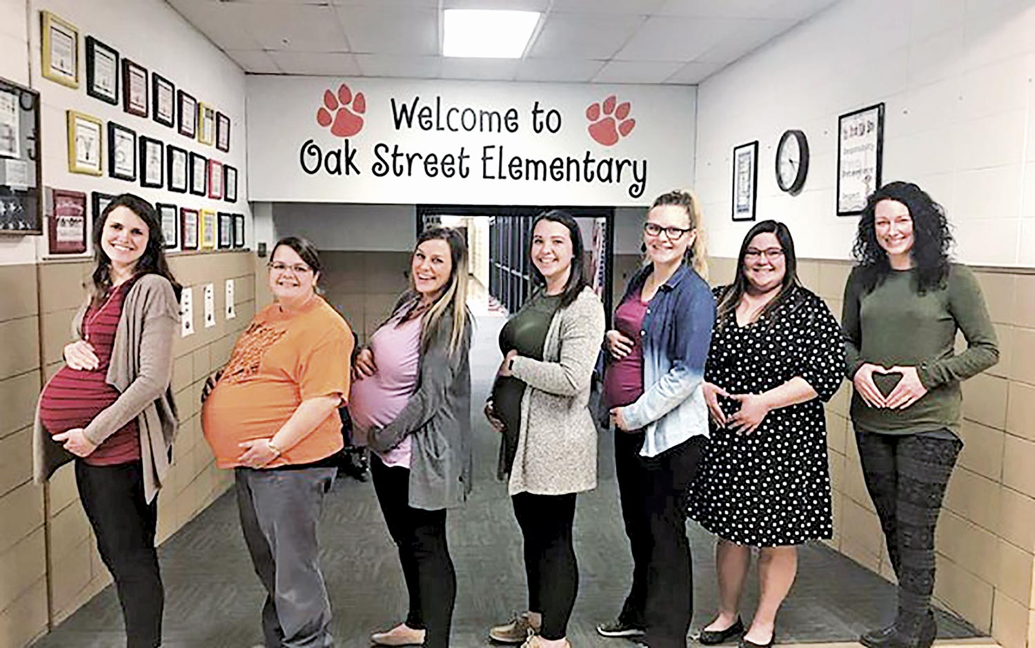 Sete professoras de uma escola no Kensas, Estados Unidos, estão chamando a atenção nas redes sociais. O motivo? Todas ficaram grávidas ao mesmo tempo. Juntas, as mulheres são metade do corpo docente feminino do colégio. “As classes de jardim de infância de 2024 estão crescendo a cada dia! Mal podemos esperar para conhecer os pequeninos”, diz a publicação feita pela escola Oak Street Elementary no Facebook ao anunciar que as professoras estão grávidas ao mesmo tempo.