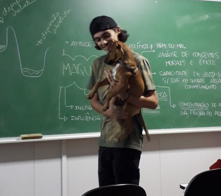 "Eu sempre quis ter um cachorro, mas era difícil por conta da correria da faculdade. Agora que tive a oportunidade, adotei a Inca, ela tem quatro meses e vai comigo para todos os lugares. Como ela tinha que passear e eu precisava dar aula, levei ela comigo para o cursinho. Os alunos adoraram e acabou sendo uma aula muito boa, mas achei que ficaria por aí", conta Jorge.