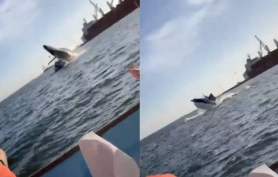 Pelas imagens é possível ver turistas que estavam em outro barco. O vídeo de 11 segundos flagou o exato momento exato em que a baleia salta, chegando a atingir o iate, causando um estrondo.