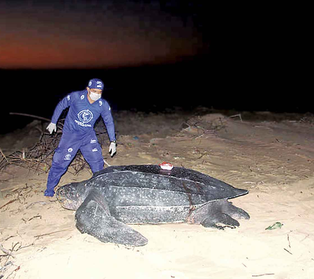Pesquisadores do Instituto Tartarugas do Delta, no Litoral do Piauí, implantaram um dispositivo de monitoramento via satélite no enorme casco de uma tartaruga-gigante, a maior espécie de tartaruga marinha. O aparelho vai ajudar os pesquisadores a entender melhor a rota desta espécie na costa brasileira. A implantação do dispositivo aconteceu durante a madrugada de quarta-feira (19), na praia da Pedra do Sal.