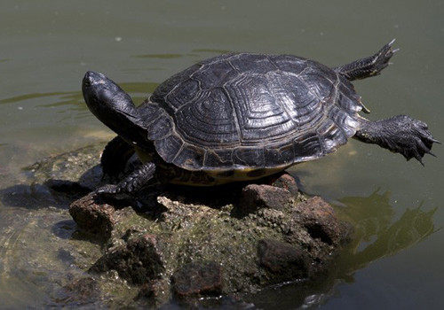Tartaruga se equilibra em pedra para “se bronzear” em parque