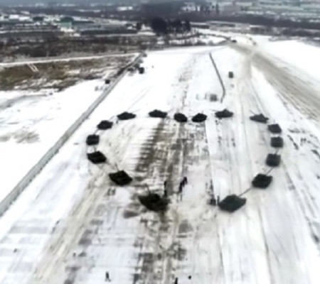 O comandante de pelotão Denis Kazantsev parou os jogos de guerra no Dia dos Namorados e ordenou que os tanques T-72B2 fizessem a forma romântica no campo de treinamento de Alyabino, perto de Moscou.E depois imagens aéreas feitas por um drones mostram a forma de coração.