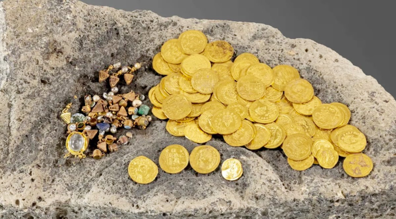 O conjunto inclui 97 moedas de ouro puro e fragmentos de joias, como brincos com pérolas, pedras semipreciosas e vidro. O achado ocorreu em julho, quando a detectora de metais Edie Lipsman identificou o tesouro entre paredes de basalto e pedras antigas.